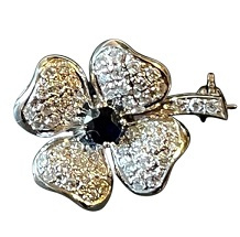 18 ct golden brooch in the shape of a four-leaf clover with dia and saphire