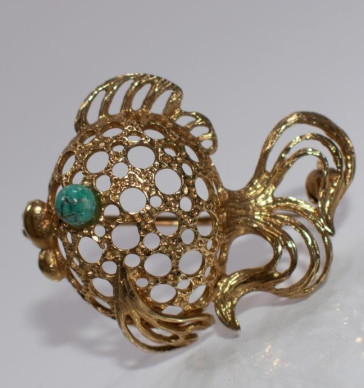 14 ct golden brooch in the shape of a fish with turquoise eye